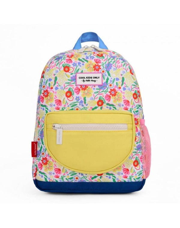 Klaar voor je eerst schooldag met deze coole Hello Hossy rugzak Garden Party?! Deze kinderrugzak met bloemetjes geschikt voor kinderen tussen 2-5 jaar en +6 jaar heeft verstelbare schouderriempjes en een gesp vooraan zodat deze niet van de schoudertjes schuiven. Een lus is voorzien om de rugzak makkelijk op te hangen en vooraan vind je een klein extra zakje met handige grote rits. In de tas zelf vindt u een naamlabel en extra opbergvak en langs de buitenzijde een houder om je drinkfles mee te nemen. Deze rugtas is voldoende groot voor een A5 formaat notebook. Handige rugzakken telkens voorzien van leuke prints enkel en alleen voor cool kids only!