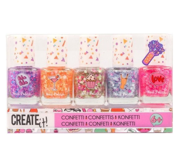 Met dit 5-pack nagellak van Create it! ben jij klaar voor elk feestje. Elk potje heeft zijn eigen confetti structuur. Ga jij voor de stylish look of wordt het een vrolijke en kleurrijke combinatie? Wordt in doorzichtig doosje in display van 6 stuks geleverd. Geschikt voor kinderen vanaf 6 jaar.