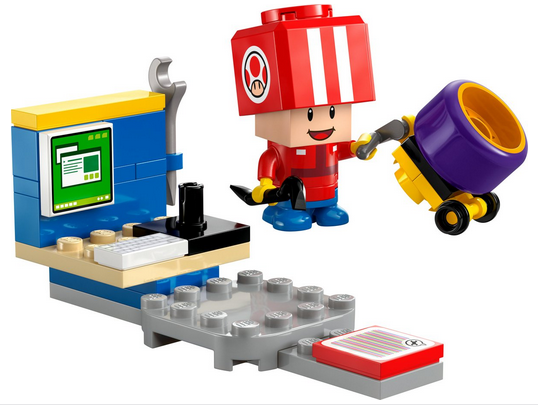 Sluit je aan bij de pitcrew met deze leuke Mario Kart speelset met een figuur van een Toad (pitstop), een werkplaats, een kartband, een wagentje en gereedschap.