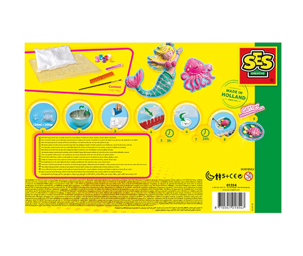 Met deze SES Gieten en Schilderen maak je verschillende oceaanfiguren. Giet de vloeibaar gips in de grote gietvorm. Laat het opdrogen en wrijf het glad. Geef de zeemeermin, dolfijn, vis, schelp en andere oceaanfiguren een kleurtje met de bijgeleverde kwast, verf en glitters.