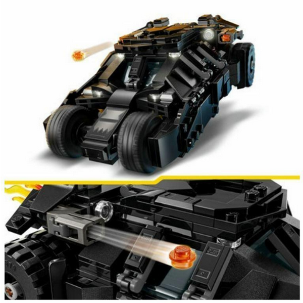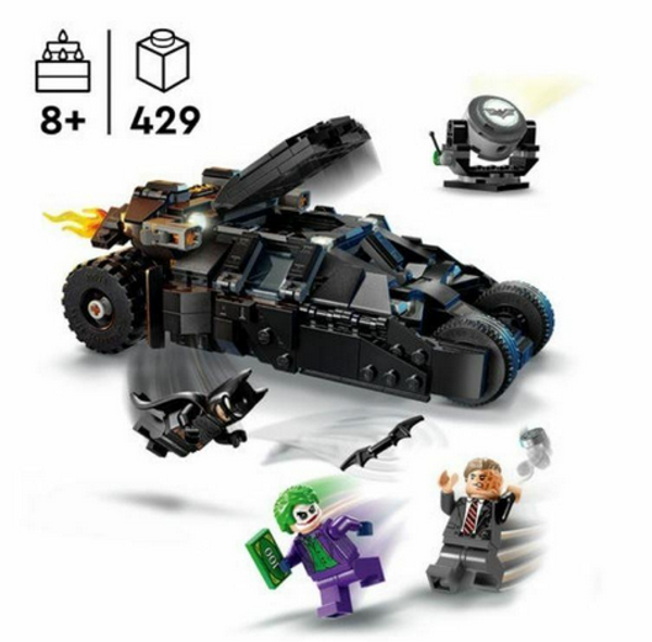 Dit LEGO Batman superhelden bouwpakket voor kinderen bevat 3 populaire minifiguren: Batman met zijn Batarang, de Joker met een stapel geld en Two-Face met zijn kenmerkende zilveren munt. De bouwbare Tumbler Batmobile kan worden geopend en bevat een bedieningspaneel en een cockpit met ruimte voor Batman. Een afneembaar vlamelement steekt uit de uitlaat van het LEGO voertuig. De Bat-Signal projector (geeft geen licht) kantelt en draait 360 graden in beide richtingen.