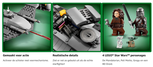 De verhalen op Tatooine uit Star Wars: The Book of Boba Fett komen voor jonge bouwers tot leven met dit LEGO bouwmodel van De Mandalorians N-1 Starfighter (75325). De starfighter beschikt over een cockpit voor een minifiguur, ruimte voor Grogu, een vrachtruimte, een schieter met veermechanisme en realistische details. Dit bouwspeelgoed is een leuk cadeau voor kinderen vanaf 9 jaar. De set is inclusief LEGO minifiguren van de Mandalorian en Peli Motto, plus LEGO figuren van Grogu (die onder fans ook bekend staat als 'Baby Yoda') en een BD Droid voor urenlange creatieve rollenspellen.