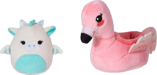 Inhoud: Elke set bevat een Squishmallow-miniknuffel van 5 cm en een flamingo-zweefvoertuig.