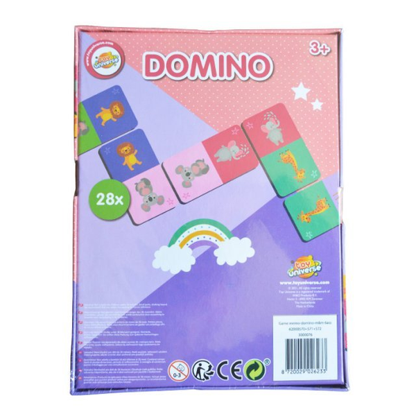 Domino spel dieren voor kinderen. Leuk spel met 28 sterke en kleurrijke kaarten met mooie illustraties van dieren. leg als eerste al je kaarten aan het zelfde plaatje. Educatief en goed voor het geheugen. Een leuk spel voor school of thuis aan de tafel.