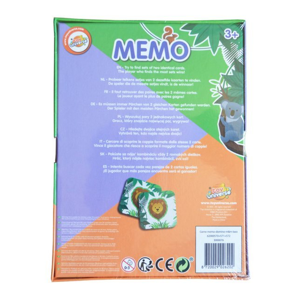 Met dit memo spel voorzien van de leukste jungle dieren leren de kinderen op een speelse manier hun geheugen gebruiken. Deze set bestaat uit 48 kaartjes van 7 x 7 cm groot, gemaakt van stevig karton en alles zit mooi verpakt in een kleurrijke doos. De spelregels staan in diverse talen uitgelegd op de achterkant van de doos.
