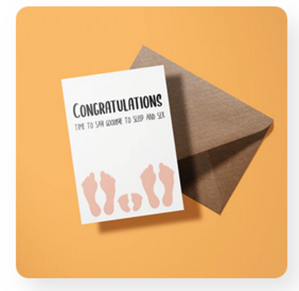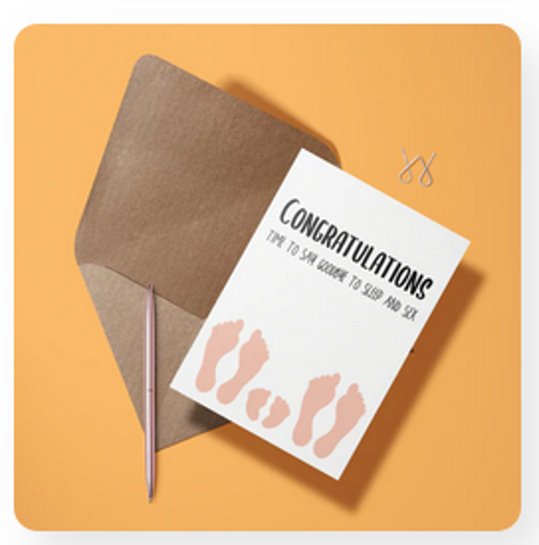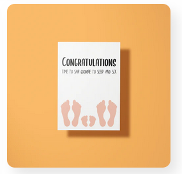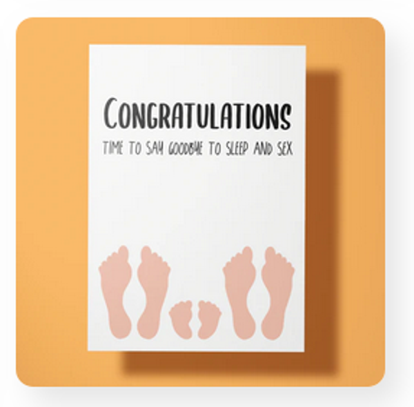 Vier de komst van een nieuw leven met een flinke dosis humor! Deze opvallende geboortekaart brengt een glimlach op het gezicht van aanstaande ouders met de tekst “Congratulations, time to say goodbye to sleep and sex.” Perfect voor iedereen die de realiteit van het ouderschap op een luchtige manier wil vieren.