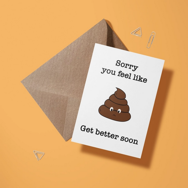 Soms zegt een poep-emoji meer dan duizend woorden! Deze hilarische wenskaart met de tekst "Sorry You Feel Like 💩" en een flinke knipoog zorgt voor een glimlach, zelfs als iemand zich echt belabberd voelt. Met een vleugje humor en een hoop liefde laat je weten dat je aan ze denkt en dat je hoopt dat ze snel weer opknappen.